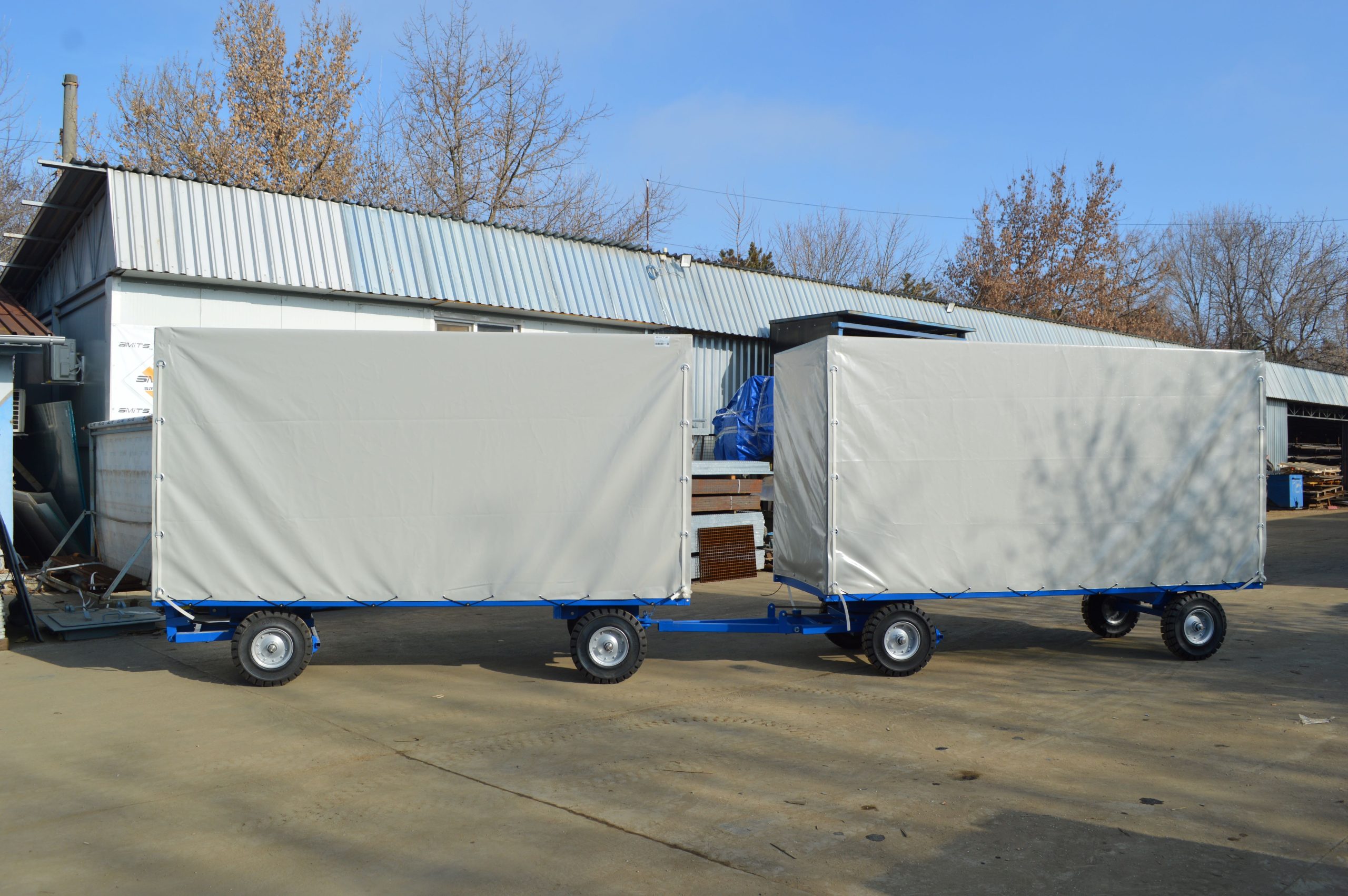 From a given theme to the design drawing to the realization of the project Smits has over 15 years of experience in the design and manufacture of industrial trailers with loads of up to 60 tons towed by forklifts or industrial tractors. In our factories, industrial trailers with open and covered platforms for heavy loads for various industrial applications have been made, the quality is ensured by the tests carried out in the factory before delivering to the beneficiary. We pay attention to details and put a lot of emphasis on safety and innovation, we build trailers for industrial use on the theme of being handled by forklifts or industrial tractors. Depending on the type of trailer, they are equipped from the factory with a shock absorption system or shock absorbers for a smooth and safe ride, on the loading surface we can install special supports on which various parts or equipment can be anchored for safe handling. What are the dimensions of the trailers built in our factories? We do not have a minimum or maximum size, we design and build what is required of us by the beneficiary. How can these trailers be towed: usually with a forklift, with industrial tractors or specific towing equipment. What are the maximum dimensions? We do not limit ourselves to a certain size, but we build the trailer according to the customer’s needs. What can these trailers transport: almost anything, they are mainly used in factories for the transport of semi-finished products or raw materials, especially heavy and bulky objects.