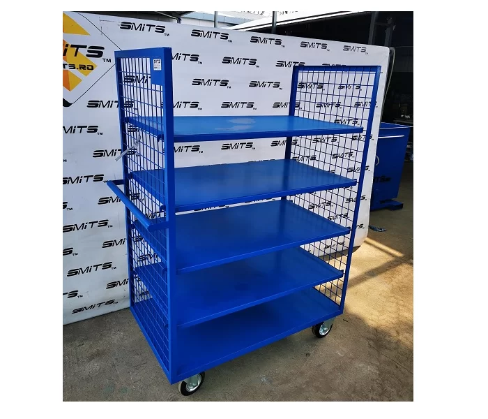 We are manufacturers and distributors of mesh wall roll containers with adjustable metal shelves. The roll container frame is made of metal profiles, and the walls are covered with mesh. We produce custom-made mesh containers for logistics in our Bucharest factory. Order now and take advantage of the best offers from SMITS, your supplier of trolleys and roll containers.