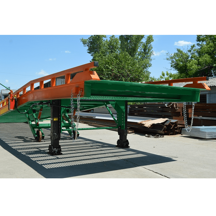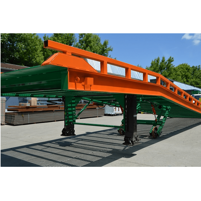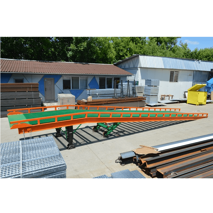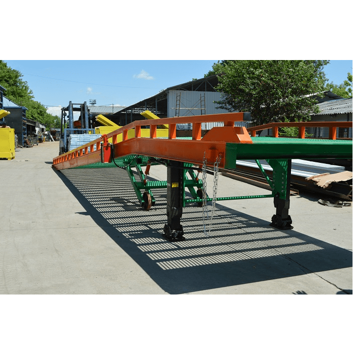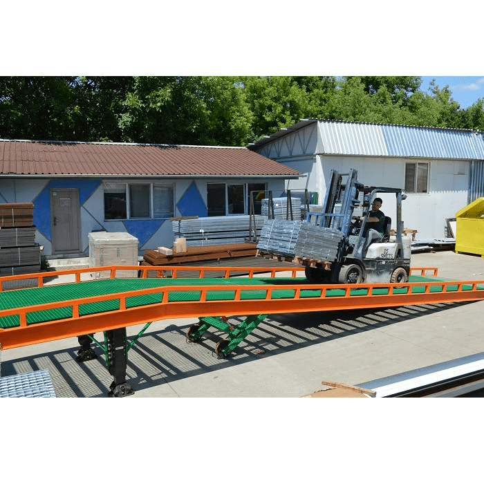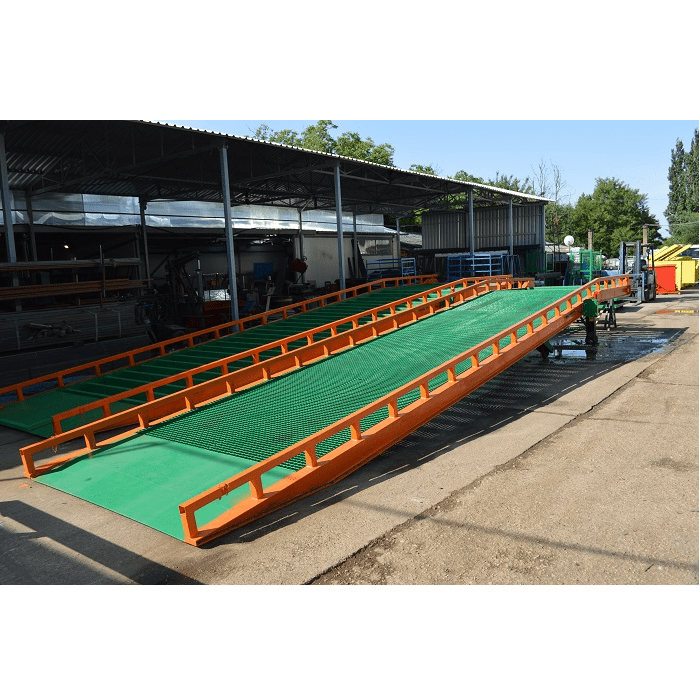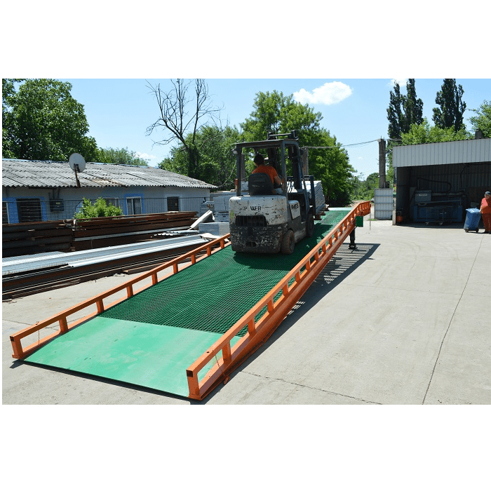 This forklift ramp is the ideal solution for efficient and safe handling of heavy loads. With a load capacity of 6000 kg and an adjustable height between 975 and 1200 mm, the ramp easily adapts to your specific needs. The running surface is made of high-quality steel (SP40X3), ensuring durability and maximum grip.