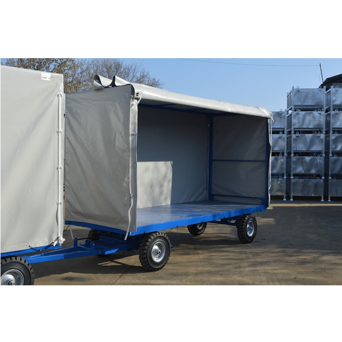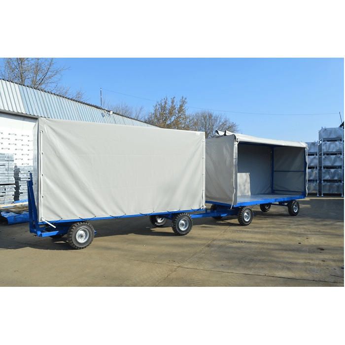 Industrial trailer with tarpaulin, with a load capacity of up to 3000 kg and a maximum speed of 25 km/h. The loading surface is standard covered with 3mm steel, with the option to use other materials. The chassis is made of welded rectangular profiles, the rear axle is independent and mounted on rubber bushings to absorb shocks, while the front axle is pivoting and equipped with bushings for better shock absorption. The connection drawbar is adjustable and fits most tractors. Upon request, it can also be equipped with a braking system that operates on the front axle. The wheels are of high quality, manufactured in the EU, with diameters ranging from 300 to 530 mm depending on the load and travel speed. The superstructure is made of rectangular profiles and is detachable; a tarpaulin is placed on top of this structure and secured with quick fasteners. Custom-made industrial trailers with a braking system can also be manufactured on request.