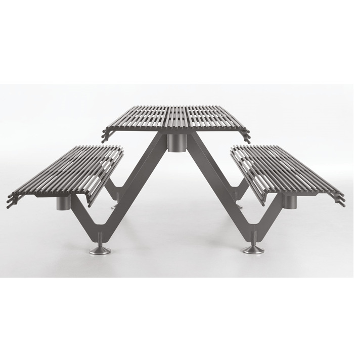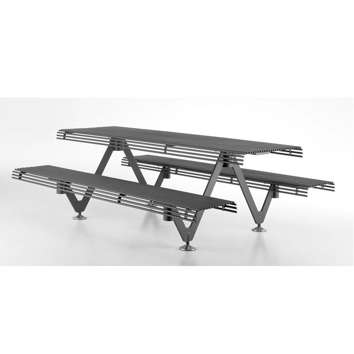 Table set + benches with a monolithic structure, where the benches are integrated into the central table frame. Assembly is done mechanically. The table and bench set has been designed to be ergonomic and visually appealing. This type of table set is recommended for installation in urban areas such as parks, restaurant terraces, or camping and picnic areas. The robust structure makes the table set resistant to vandalism and heavy wear. The set is available in a wide range of colors from the RAL palette.
