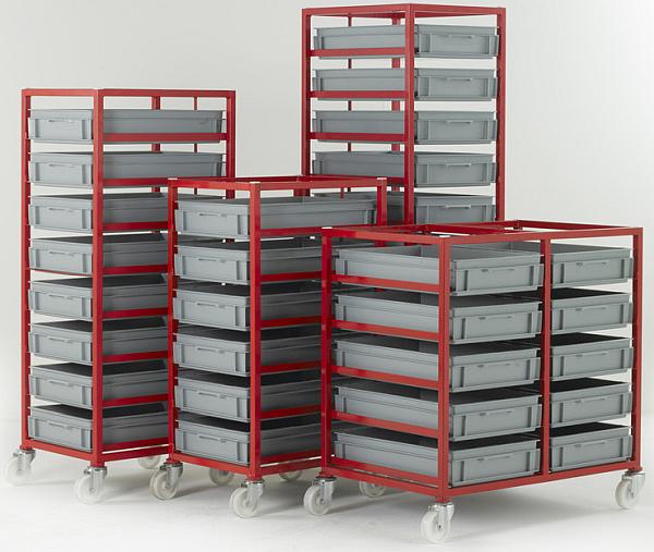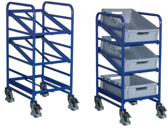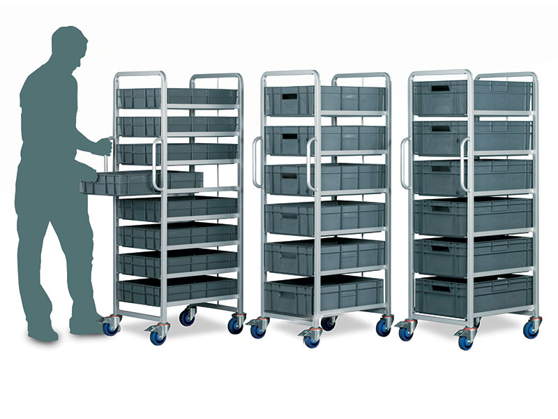 For sale at factory price special trolleys for plastic boxes standard size 600×400 mm the trolleys can store from 3 to 16 boxes arranged horizontally or inclined for production areas. These trolleys for euroboxes are ideal for picking orders or near workstations where you can store assemblies, on order we manufacture these trolleys in other configurations.