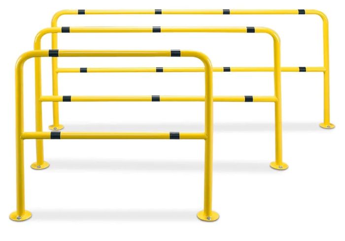 Finished in a striking RAL 1003 yellow powder coat with contrasting black bands, these hoop guards are engineered to catch the eye, ensuring that pedestrians, machine operators, and drivers are always aware of potential hazards.Robust Construction: