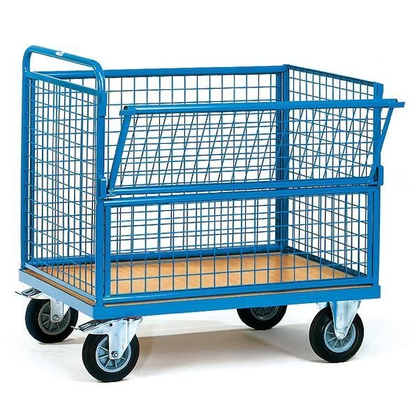Ideal for parcel handling or picking, featuring a side flap and 50×50 mm mesh walls. The metal chassis is constructed from rectangular and round steel tubes. The standard platform is made of steel, with an 18 mm plywood option available. The trolley comes with two swivel wheels and two fixed wheels, with metal rims and durable rubber bands, available in 125 mm or 160 mm diameters. An optional configuration with all four wheels swivel is also available.Trolleys can be customized in any size and color. Optional modifications can also be made to enhance operational efficiency.